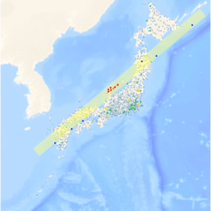 Yahoo!のリアルタイム震度の正距方位図法から、能登で群発している地震を中心として黄色の線を引いたところ、ほぼ直線上でした。